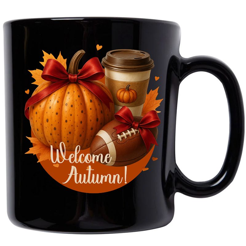 Celebrate the cozy autumn season with the Welcome Autumn Black Mug—a stylish, high-gloss ceramic cup featuring a cheerful fall design. The vivid artwork displays a pumpkin, football, and takeaway coffee cup, all adorned with festive red bows and warm autumn leaves, beautifully set against a sleek black background.